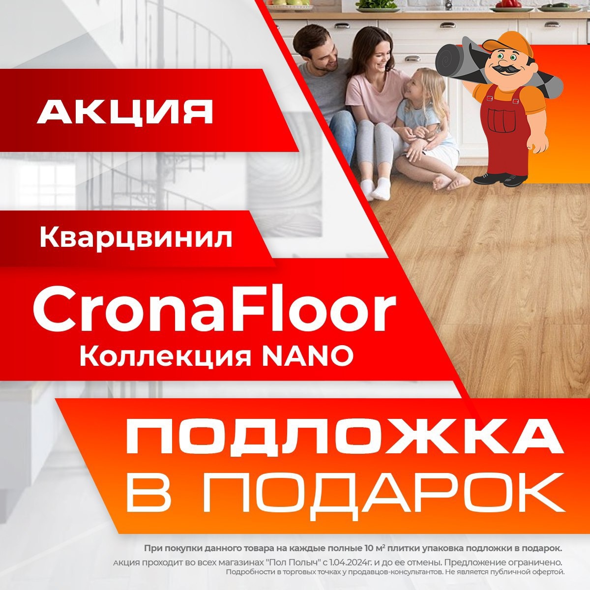 При покупке кварцвинилового ламината CronaFloor Nano получите подложку в подарок!