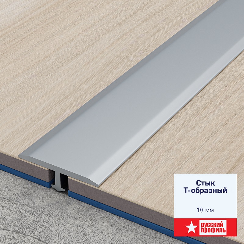 Стык алюминиевый Т-образный предназначен для маскировки монтажных зазоров, остающихся между двумя участками расположенных в одном уровне однородных либо различающихся напольных отделочных материалов.