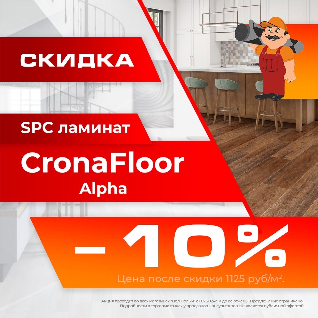 Невероятное предложение: цена после скидки всего 1125 р/м². Обновите свой интерьер с качественным покрытием от CronaFloor.
